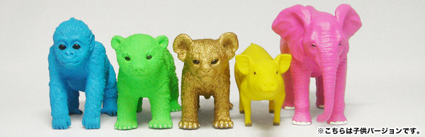 ゾウ・ブタ・シロクマ・ゴリラ・ライオンの5種類、それぞれに子供バージョン・大人バージョンがあります。いろいろ集めて、自分だけの動物園を作ってみるのもいいかも!?