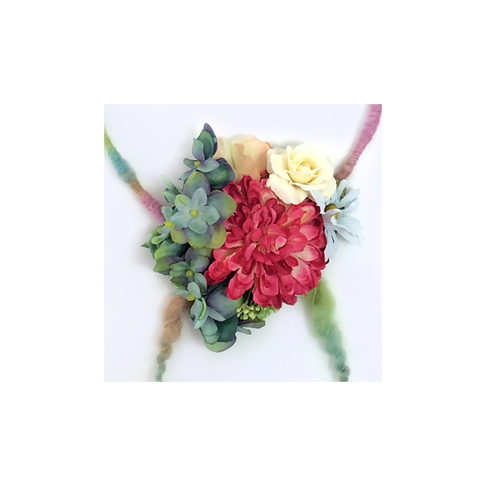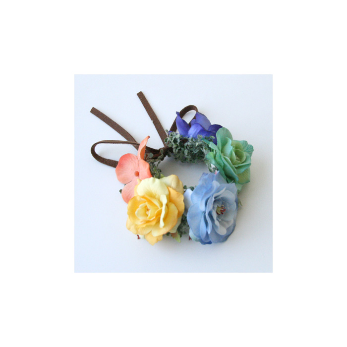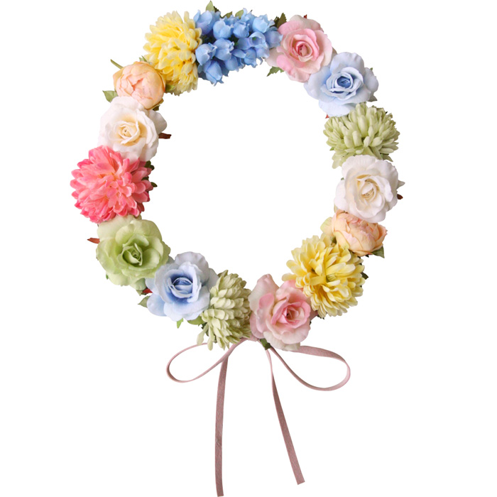 数種の小花がたっぷりついたパステルカラーのリースは、壁やドアに飾っても素敵なアイテムです。サイズはリボンで調整可能。