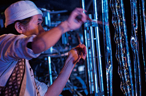 「いや、想像などしない。楽器と向かい合った時に、音は出てくる。その楽器が持っている音が。私は、そこにいる精霊たちと交信するために、何時間もじっと集中し、精霊たちが闊歩する真夜中から明け方にかけて音を出すんです。私は、縄文鼓から演歌までやってきて、音楽の始まりというものがわかった。
