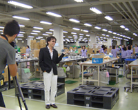 当日は朝8時半に集合ということで、菊地さんは前日全く寝ていない状態でツアーに参加。本人曰く「いつもはこのくらいの時間に寝はじめる」のだそう。バスに揺られること約3時間で一行は静岡県榛原郡にある静岡プロダクションセンターに到着。引率の方に丁寧な説明を受けつつ待望の工場に入るとそこにはなんと……、何台もの無人CD運搬マシーンが我々をお出迎えしてくれました(ってただCD運んでただけなんですけどね)。さらに、CDの素材となるポリカーボネイトの形成からディスク情報の転写、CD面の印刷までを一台でこなす超ハイパーなマシーンと、笑顔がキュートなんだけどもの凄いスピードでCDの特殊ケースにライナーを入れていくおばさまたちに囲まれ、菊地さんは感嘆の声を何度も上げつつ笑いが止まらない状態になっておりました(笑)。