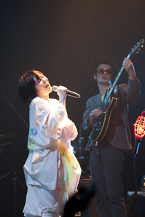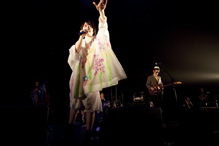 ほぼ定刻に客電が落ちると、超満員のフロアから歓声が沸きあがる。ルーツ・レゲエが流れ、緑の照明が照らすステージに現れたのはTHE GOSSIP OF JAXXの面々と、バンマスの森雅樹(ギター)。強烈なピアノの連打を合図に咆哮を上げる、フリーキーなアンサンブル。不穏な音塊が会場に充満したところで、ヴェールを被った中納良恵(ヴォーカル)が登場した。スモークが立ち込めるなかを練り歩き、赤いライトを振り回す。クラウト・ロックのごとき、サイケで呪術的な光景に、クラクラしつつも高揚せずにはいられない。強烈なハンマー・ビート、ニューウェイヴィーなギター・カッティング、タイトにうごめくベース・ライン……。その上で中納は、時にマラカスやタンバリンを振りながら、ダイナミックに歌う。前半は、ロッキンなカタルシスいっぱいの楽曲が次々に繰り出され、フロアをカオスに導く。