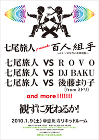 今年9月にやけのはらとのコラボ・シングル“Rollin' Rollin'”をリリースし、ゆるゆるメロウな極上アーバン・サウンドで幅広い層のリスナーを魅了した七尾旅人。彼の主催によるライヴ・イヴェント〈七尾旅人 presents 百人組手 vol.2 ~10年代の不屈精神~〉が、2010年1月9日(土)に東京・恵比寿LIQUIDROOMにて開催される。