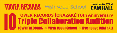 タワーレコード岡崎店が、地元のヴォーカル・スクールであるWish Vocal Schoolおよび老舗ライヴハウスのCAM HALLとコラボレートして行っているオーディション〈TOWER RECORDS [OKAZAKI] 10th Anniversary Triple Collaboration Audition〉。その予選審査通過者が決定しました!