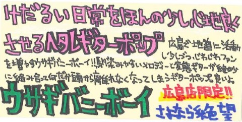 このプロジェクトでは、店舗スタッフの推薦によって選ばれたアーティストの音源をCD化。まずそのショップのみの数量限定盤として販売をスタートし、ほかの店舗やTOWER RECORDS ONLINEでの取り扱いにつなげ、全国に発信していくというものです。広島店がプッシュするウサギバニーボーイは、メンバーが登録制になっており、ライヴごとに参加メンツが異なるという一風変わったグループ。ヴォーカル/ギターの高宮悠治が紡ぐメロディーを軸とするギター・サウンドが、1曲のなかでさまざまな表情を見せるのが特徴です。広島店にお越しの際は、ぜひ“さよなら絶望”をチェックしてみてください!