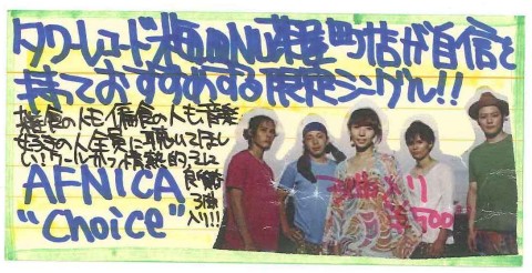 今回、梅田NU茶屋町店がプッシュするAFNICAは、2007年に結成された5人組バンド。ジャズをベースにロックやダブ、ドラムンベースなどの要素を採り入れたサウンドや、紅一点ヴォーカル・Keiのキュートかつパワフルな歌声で人気を集めており、エマーソン北村、蔦谷好位置、GOMAといったミュージシャンや、大阪のラジオ局、FM802の人気DJである中島ヒロトやマーキーなどからも注目される存在です。梅田NU茶屋町店にお立ち寄りの際は、ぜひ“Choice”をチェックしてみてください!