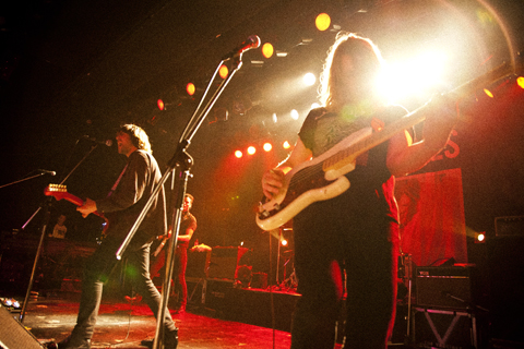 その後しばらくの間を置いて、ついに主役のヴァクシーンズが登場! ラモーンズの大名曲“Do You Remember Rock 'N' Roll Radio?”を出囃子に姿を現した彼らは実質的なデビュー・シングルの収録曲“Blow It Up”からライヴをスタート。親しみやすいメロディーとリヴァーヴの効いたギター・サウンドの絡みはジーザス&メリーチェインなどを彷彿とさせる感じで、初っ端からUKギター・ロックの未来を担うバンドとしての存在感を際立たせます。そこからバスドラが途切れることなくビートを刻み、同じシングルのもうひとつのリード曲“Wreckin' Bar”へと突入! さらにストロークスのアルバート・ハモンド・Jr.とのコラボにより制作された話題曲“Tiger Blood”へと繋げ、会場を一気にヒートアップさせます。