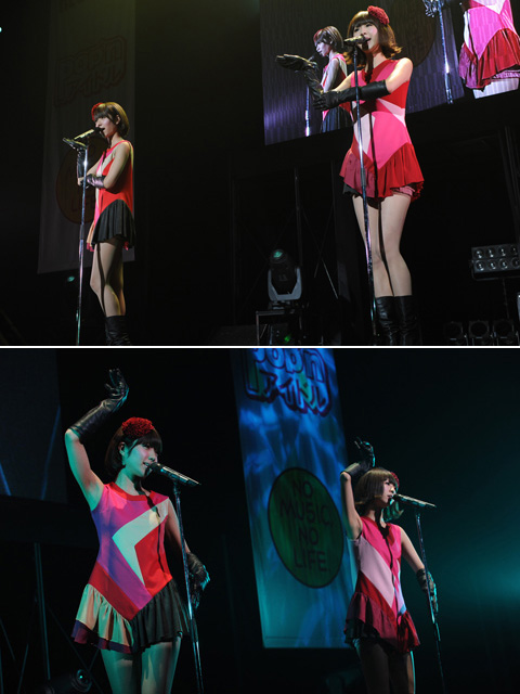 ライヴのトップバッターを飾ったのは北欧の風に乗ってやってきた2人組、バニラビーンズ。彼女たちのイノセントな魅力が詰まった渋谷系ポップス風の“サカサカサーカス”から始まり、今年1月に発売された最新シングル“トキノカケラ”と代表曲“ニコラ”の計3曲をパフォーマンス。モデルのようなスリムな体型が映える、動きを抑えた可愛らしい振り付けでオーディエンスを魅了していきます。MCではレナちゃんが「いま一押しのアイドルは東京女子流の新井ひとみちゃんことひーちゃんと、庄司芽生ちゃんと、LinQのあーみんとゆうみん、そしてSUPER☆GiRLSさんのあみたこと前島亜美ちゃん、そして、スマイレージのDAWA(ダーワー)こと和田彩花ちゃんでーす!」とアイドル好きをアピール。リサちゃんも「趣味は海外旅行とお買い物。よく買い物に行くところはタワーレコードです!」と語って会場を盛り上げました。
