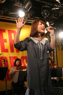 同店で配布した入場券を持つ一部のファンのみが参加できたこのイヴェント。今回のシングル収録曲すべての作詞/作曲/編曲を手掛けた中塚武を筆頭に、ギター、サックス&フルート、ヴァイオリン2名、ヴィオラ、チェロという豪華編成の生演奏をバックに、まずは表題曲“初恋ノオト”を披露。爽やかなアレンジに乗って瑞々しい歌声を聴かせる。続くサンバ風のノリノリなポップ・チューン“裸足のvacation!!”では、「ラーラーラーラーラーってところがあるんですよ。みんなで歌ってほしいなあって思います」という彼女のお願いにオーディエンスも満面の笑みで応え、みんなで右に左にと青いサイリウムを振って早くも会場は一体に。最後は「初恋のことなどを思い出しながら聴いていただけたら」という“虹のそら”をしっとりと歌い上げてライヴを終えた。