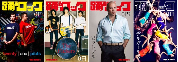 左から、トゥエンティ・ワン・パイロッツ、The Flickers、ピットブル、モデルガールズ〈踊るロック〉冊子 表紙画像