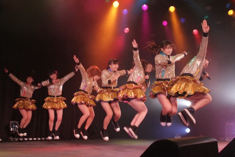 さらにヒーローちっくな振り付けが可愛らしい“マーブルヒーロー”と、〈せっきー〉こと関根梓の投げキッスも胸キュンな“バレバレ I LOVE YOU”を立て続けにパフォーマンスした彼女たち。その後のMCで行われたメンバーの自己紹介では、佐保明梨が得意の空手による3枚連続の板割りを成功させるなど、それぞれが持ち味を発揮します。そしてサビ部分の振り付けをファンにレクチャーしてから、本日初披露となる新曲“リスペクトーキョー”を投下! ラップのパートを含むこの楽曲は、東京でアイドルになることを夢見る女の子が主人公で、EDM系サウンドの可愛らしくてカッコいいナンバー。ステージとフロアは、サビのフレーズ〈リスペクトーキョー〉と〈原宿なう〉で一体感に包まれます。
