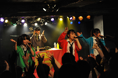 続いて、代表曲のひとつである“SUPERMCZ TOKYO”で会場のボルテージをさらに上げたところで、もう一方のシングル表題曲“世界中にアイラブユー”へ。曲の前にはMIRIが新曲のジャケットやアートワークについて語り、グループの原点とも言えるライヴハウス・四谷ライブインマジックのステージ袖の写真が掲載されていることに触れ、「〈ここからスタートする〉ということだね」と解説。コミカルなトラックに等身大の彼女たちの可愛らしさを綴ったラップでお客さんへの感謝の気持ちを歌い、会場は笑顔でいっぱいになります。