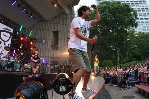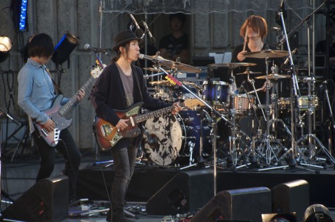 4年前の春、ほかでもないこの日比谷野音でのライヴを境に彼らは4人編成となったわけだが、それをひとつのきっかけとして彼らは以前にも増してシンプルに真っすぐに音楽を鳴らすことに突き進んでいくようになっている。この日のステージでも、さまざまなタイプの曲を披露しながら、そのシンプルで真っすぐな思いはいよいよ鮮明になっていき、だからこそオーディエンスもなんの気兼ねもなく、その音楽に身を委ねられる。雨が降っても降らなくても、とにかく音楽って気持ちいい。そのことだけに向かって演奏は続き、会場の一体感は深まっていった。