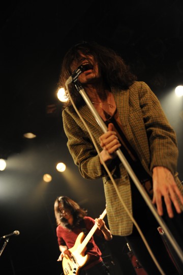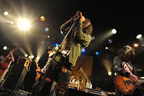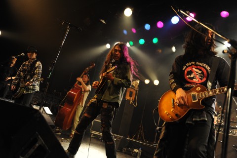 8番手で登場したのは、ヴォーカルの伊藤雄和が持つマンドリンをはじめ、バンジョー、アコーディオン、ウッド・ベースといった楽器を含む編成のラスティック・バンド、OLEDICKFOGGY。ライヴは2011年発表のアルバム『いいえ、その逆です。』の収録曲“カーテンは閉じたまま”からスタートし、ジャンルや時代を飛び越えるようなサウンドとエモーショナルなパフォーマンス、メッセージ性の強い歌でオーディエンスの心をガッチリと掴みます。疾走感溢れる“Blow itself Away”やハードコア的な側面を持つ“暗転”ではダイヴァーも出現し、ラストの名曲“月になんて”まで、LIQUIDROOMを独特の祝祭空間に変えていました。