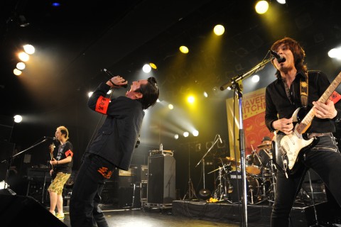 11番目に登場したのは、〈MAVERICK KITCHEN〉初参戦のKING BROTHERS。ケイゾウ(ヴォーカル/ギター)とマーヤ(ギター/スクリーム)が当然のようにアンプに登ると、“マッハクラブ”で狂乱のライヴの幕が上がります。特に1回叫ぶごとにマイクを客席に投げ込むマーヤは、自分もフロアに飛び込むとファンに支えられて立ち上がったり、彼らの地元である兵庫・西宮をコールさせたりとやりたい放題。しかし2曲目“ルル”のブレイク部分でバンドがバッチリ息を合わせるなど、カオスのなかにロックンロールの醍醐味を凝縮したようなパフォーマンスが続きます。最後にドラム・セットを含め機材をフロアに下ろし、オーディエンスの真ん中で演奏した“☆☆☆☆”はこの日のハイライトのひとつとなりました。