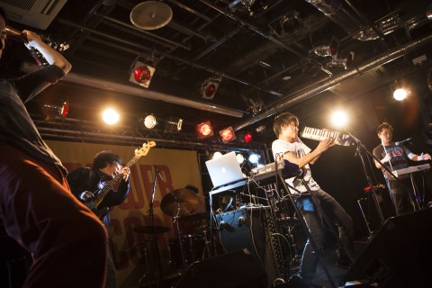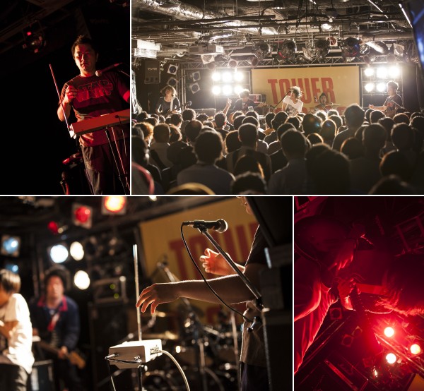 〈旅立ち〉をコンセプトとする彼らのニュー・アルバム『DOCUMENT』の発売日である9月11日に行われたこのイヴェント。平日の21:30という遅めのスタートだったにもかかわらず、会場はライヴを待ちわびるオーディエンスでいっぱい! みなさんほどよくお酒が入っていたためか(?)、〈CUTUP STUDIO〉は熱気でムンムンです。この日のイヴェントが〈NMNL?〉ポスターと連動しているというタワーのスタッフによる説明や、ポスターのメイキング&インタヴュー映像の上映に続き、いよいよあら恋のメンバーがステージに登場します。