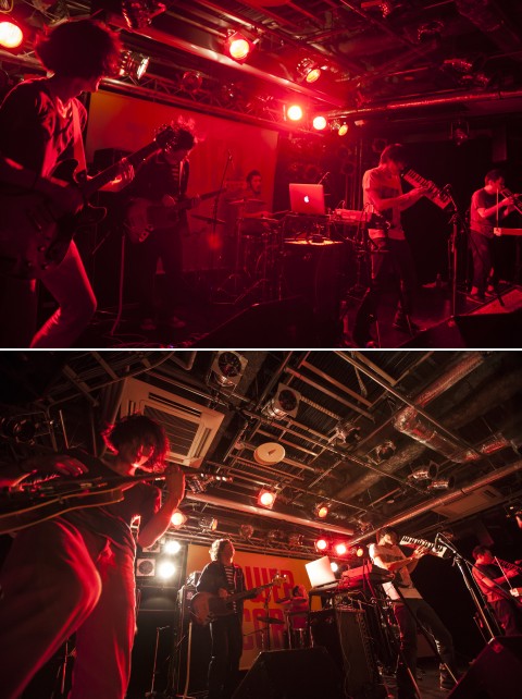 オープニングを飾ったのは、『DOCUMENT』の1曲目でもある“カナタ”。ダブを基軸としつつシューゲイザー的な爆音ギター・サウンドも採り入れたあら恋ならではのエモーショナルなスタイルで、早くもオーディエンスをがっちりロックします。続けてさらにアッパーな“Res”を繰り出し、池永正二の鍵盤ハーモニカやKuritezのテルミンが奏でる切なくもハート・ウォーミングなメロディーと、高揚感を煽るダイナミックなグルーヴに会場はますますヒート・アップ。次の“Conflict”はフロア映えのするクールなダンス・ビートのナンバーで、ミニマル・ダブを思わせるリズムとドゥーム・ロックばりのヘヴィーなギター・リフが入り混じった“テン”と共に、バンドの多彩な音楽性を見せつけます。