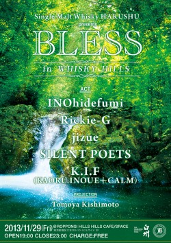 今回の企画は、六本木ヒルズで展開されるウイスキー文化を発信するイヴェント〈WHISKY HILLS〉のスペシャル・ライヴとして行われるもの。INO hidefumi、Rickie-G、jizue、SILENT POETS、KAORU INOUEとCALMのユニット=K.I.Fの5組が、臨場感あふれる生演奏とダンス/チルアウトを絶妙に織り交ぜたDJスタイルのサウンドを届け、Tomoya Kishimotoが360°プロジェクションによる幻想的な空間演出を担当する。