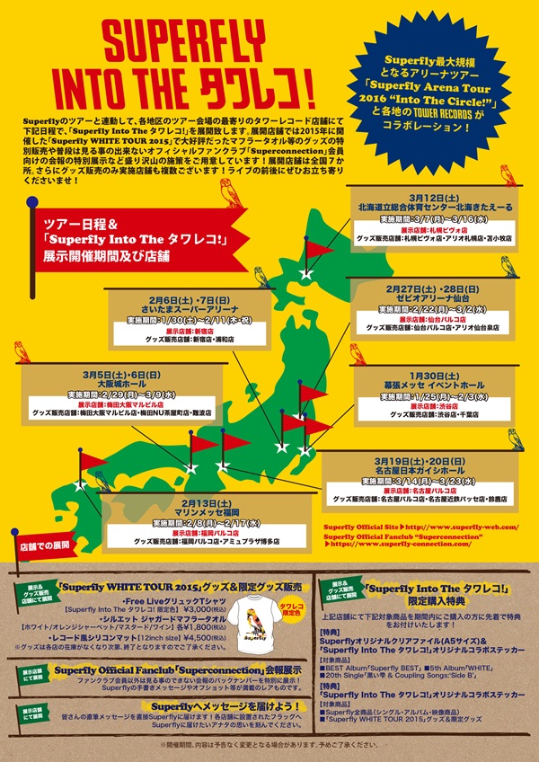 Superflyのツアーと連動して、各地区のツアー会場の最寄りのタワーレコード店舗にて下記日程の期間に「Superfly Into The タワレコ!」を展開致します。