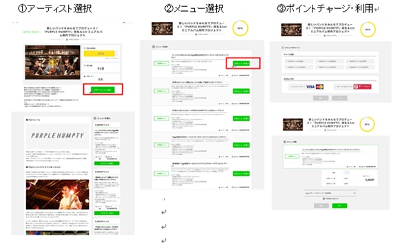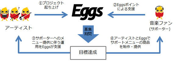 〈Eggsサポートプロジェクト〉では、アーティストが〈Eggs〉オフィシャルサイト上で自らのプロジェクトを立ち上げ、楽曲配信やCD、ミュージックビデオの制作、ライブ等のイベント実施といった自分が実現したい活動、目標金額(Eggsポイント※2)等のメニューを設定します。ファンは、Eggsポイントを使って気になったアーティストが立ち上げたプロジェクトのうち、気に入ったメニューをサポートし、成立した場合は、サポートしたファンへメニューに応じた商品を提供いたします(※3)。