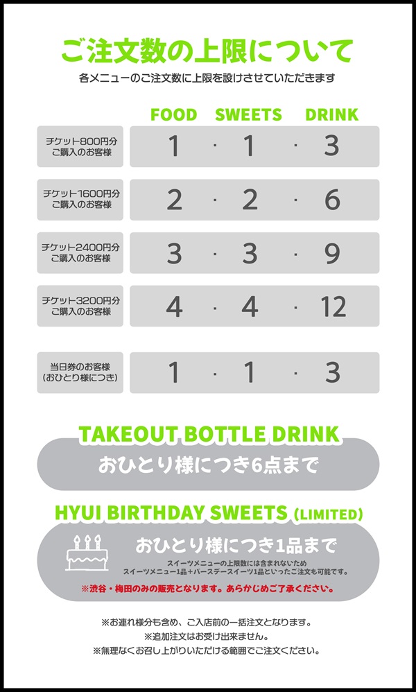 ※電子チケット券面に記載の座席番号順に入場前の整列/メニューのご注文/入場/グッズ購入を受付いたします。