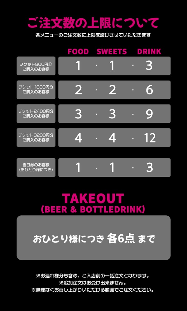 ※電子チケット券面に記載の座席番号順に入場前の整列/メニューのご注文/入場/グッズ購入を受付いたします。