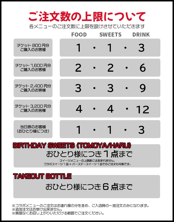 ※券面に記載の座席番号順に入場前の整列/メニューのご注文/入場/グッズ購入を受付いたします。