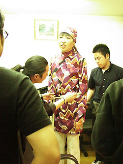 和田さん、控え室に到着後、撮影用の衣装にチェンジ。普段、テレビから受ける 印象とは異なるファンキーな感じでビシっとキマってます。で、早速、撮影現場へ。