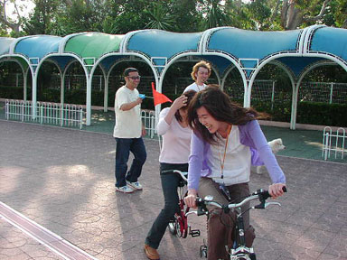 撮影終了後のヒトコマ。息が合わないと乗りこなせない二人用チャリ。制作スタッフの女性コンビは全然ダメダメ。あまりのダメさ加減にゴールデンコンビから水鉄砲攻撃を受けて、ビショビショになってました。ウヒャヒャヒャヒャ。まだまだ修行が足りんぞ、チミタチ(笑)。