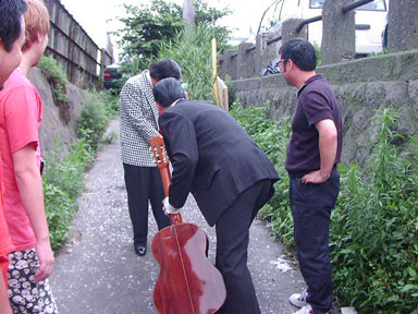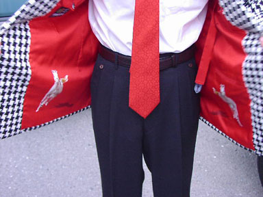 撮影場所にて。剣さんが何をしてるかというと、宮さんのジャケットの内側にある刺繍をチェックさせてもらっているんです。その刺繍は…白馬!大人にしか出来ないイキなお洒落ですね。