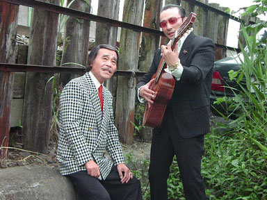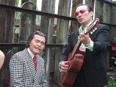撮影スタート。コンセプトは<粋な流しの二人組>。剣さん、若干緊張気味の様ですが、ギターを奏でるよう平間さんから指示がでると、なんと宮さんの大ヒット曲“女のみち”を唄いだす。始めは照れくさそうにしていたお二人ですが、最後はこんなに気持ち良さそうな表情でセッションしておりました。ん~正に<NO MUSIC, NO LIFE>ですねぇ~。