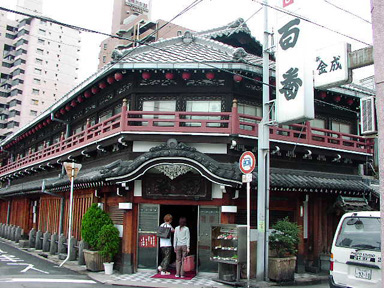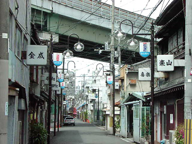 今回の第一撮影場所となったのは、大阪は西成区山王にある<鯛よし百番>というお店。ここは大正時代初期、遊郭だった建物をそのままに、現在は料理店として営業中。周囲にあるお店はごらんの通り、大人の遊び場として今も営業を続けています。店内の煌びやかさには歴史の重みを感じます。