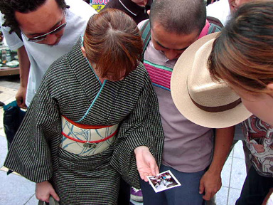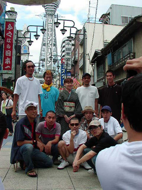 で、撮影。通天閣を背に集合写真っぽいんだけど、全然そうは見えない辺りがイイですねぇ。座ったパターンの物と立って並んだものを撮り、最後に皆さんにポラチェックをして貰って撮影は終了。この後、メンバーは練習へと向かったそうです。