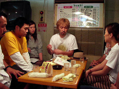 別に箭内さんが責められているワケじゃありません(笑)。次回のTV-CMはデタミの皆さんに出て頂くこともあって、撮影後スタッフで打合わせを敢行。左側で黄色のT-シャツを着ているのがCM制作ディレクターの野村さんで、GOING STEADYやDRY & HEAVYのヴァージョンを手掛けてくれた人です。てなワケでこれにて大阪ロケは全て終了。皆さん、本当にお疲れ様でした!