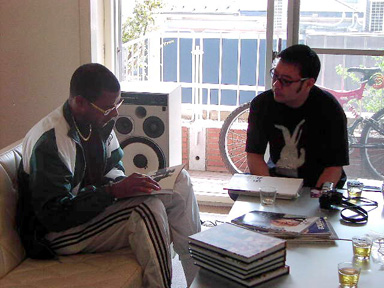事務所へ戻って平間さんとSHABAZZさんがご対面。そこへ到着したのが、SPHEREさん。今回は「BACK IN THE DAYS」をアディダスがバックアップしているという事もあり、SPHEREさんは、早速ジャージに着替える。その姿はデビュー当時のL.L.COOL.Jのよう。AIさんはメイク中。