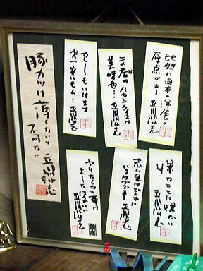 ハイロウズ&談志師匠を待つ間に、大木の店主である松浦さんが出ているビデオをスタッフで鑑賞。歯に衣着せぬ物言いに皆で大爆笑しました。で、店に飾ってある談志師匠直筆の短冊がコチラ。左端のモトンカツは薄くないと不可なりモと書いてある様に、大木では絶妙な厚さでカラッと揚げられたトンカツが出てきます。そして、最近では恒例化してきた箭内コンテ(笑)。今回はかなり書き込んでますよね(笑)。