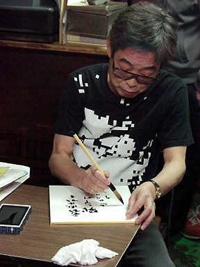撮影も終了し、再び店内へ。談志師匠にお願いして、色紙にお言葉を頂きました。そこに書かれた言葉を感慨深く眺めるハイロウズの面々。ハイロウズは次の仕事が控えているのに、この後も談志師匠との話は尽きず、次の現場に間に合うのか、スタッフ一同ドキドキでありました(笑)。