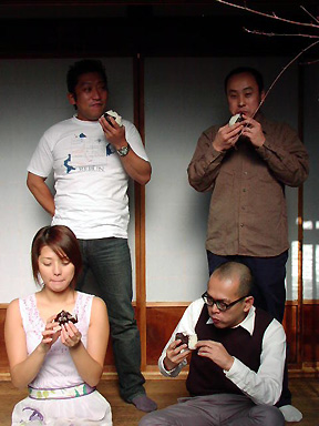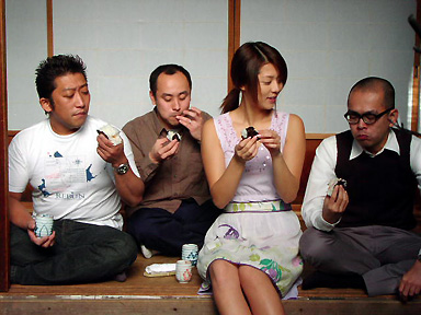 (11)(12)今度は出来たおにぎりを縁側で食べる、というシチュエーション。4人で座っておにぎりを食べてるとなんか<めぞん一刻>風です(笑)。実は箭内さん、そこを狙ってたそうですが(笑)。