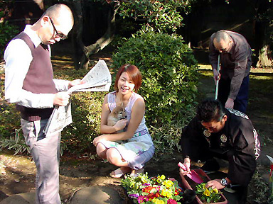 (19)続いては植木職人でもある田森さんに仕事着に着替えてもらって、皆で庭のお手入れ。田森さんは花の植え替え、二宮さんは掃き掃除、吉野さんは新聞を読み、吉岡さんはモモちゃんを抱きながら田森さんの仕事を鑑賞。途中、吉岡さんファンの田森さんは「モモちゃん、イイなぁ、一番おいしいなぁ。」と発言、周囲は大爆笑でした。