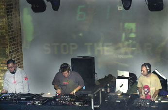 そしてもうひとつは、米英軍のイラク侵攻のニュースを受けた翌日の3月20日、ロンドンの巨大クラブ、ファブリックではジェームズ・ラヴェルを中心に、反戦クラブ・イベント「Wrong War」が開催された。この日は著名DJ総出演に加え、アンクルの新曲が初公開との噂もあり、早めに足を運んだが、外にはすでに長いキューが…。一見、いつもと変わらない週末の夜の光景だが、ひとつ違うのは、みんなが口々にイラク攻撃のニュースやテロ脅威を話していること。中に入るとすでに3フロアともフル稼働で、すでにパルプのジャーヴィス・コッカーがDJプレイ中。ブラック・サバスやステイタス・クォーなどのハードロック・ナンバーでクラウドの胸をわしづかみにし、イベントの盛り上がりが最高潮に達した夜中すぎ、今夜の主役、ジェームズ・ラヴェルがブースに姿をみせ、続けてイアン・ブラウンがステージに登場。アンクルの“Be There”、イアンの“If Dolphins Were Monkey's”の後、ついにアンクルの新曲“R.E.I.G.N.”を初披露、会場はどよめいた。他のフロアでもXpress2、リチャード・フェアレス、デイヴ・クラーク、スクラッチ・パーヴァーツ、コールドカットのジョナサン・ムーア、ハウィーBなどのDJ勢が入れ替わり立ち替わりプレイ。パーティーは午前3時まで続いた。また「ONE BIG NO」と同じくこの「Wrong War」もすべてアーティストやDJは無償で出演、収益のすべてはCND(核兵器廃絶運動団体)や反戦団体に寄付される。