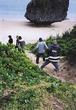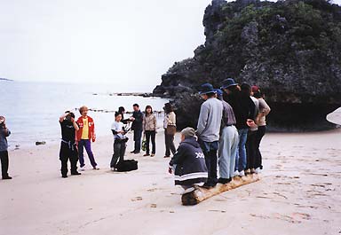 撮影現場近くの駐車場でHYのメンバーと待ち合わせ。早速、HYがPVを撮影した事もあるというビーチへ移動。今回撮影に参加していただくのは、ボカルhide君のおじいさん「ケンさん」。80才を越えているとは思えないほど元気。且つ姿勢もいい、長寿県沖縄のなせる技か。(7)(8)(9)(10)