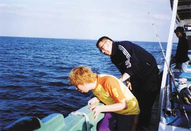 いよいよ本日のメインイベント。競演していただいたケンさんの船「隆福丸」に乗船して太平洋へ。メンバーは釣り竿を持ち出し楽しそう。一方、平間さん、箭内さんをはじめ制作スタッフは船酔い+船から落ちまいと必死。一時間ほど太平洋クルーズを楽しみながら撮影。とうとう箭内さんが船酔い?で撮影終了となりました。(この「隆福丸」はHYの次のアルバムの曲のタイトルにもなっています)(19)(20)(21)(22)(23)