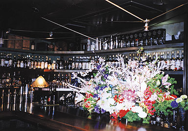 今回の撮影現場は、青山界隈では老舗中の老舗BAR“RADIO”。外からは一見わかり辛い。しかし、その看板や門構えは堂々としていて、白いスタンドカラーシャツを着たバーテンダー尾崎さんの佇まいそのものと言ったところ。ちなみにRADIOのロゴはあの田中一光さん、エンブレムは和田誠さんによるデザイン。 店内には尾崎さんが開店以来ずっと週4回生けていると言う切花が迎えてくれます。