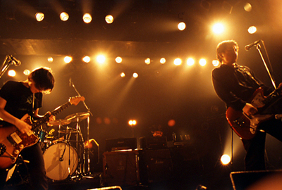 もう溢れんばかりのオーディエンスの前に登場したbloodthirsty butchers。ギターとベースを挟むようにステージ中央に田渕ひさ子が立つという布陣がまず新鮮で、思いっきりギターを弾きまくるチャコさんの勇姿が眩しいっす。眩しすぎっす。ナンバーガール後期では、変則リズムに絡まるようなニューウェイヴィーなリフを主体にしたギター・プレイを聴かせていた彼女ですが、ブッチャーズではスキマを埋め尽くすフィードバック・ノイズ・ギターを放射しまくりで、これがまたカッコイイのなんの!! そしてもちろん注目はステージ右手の定位置で無敵のオーラを魅せる吉村秀樹。殺伐ノイズの次にいきなり美麗アルペジオに転調したりするギター、そしてこちらも彼独自のメランコリックな歌メロと、ブッチャーズの魅力を遺憾なく発揮してました。