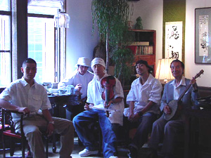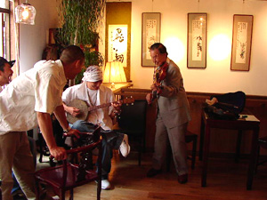 撮影の小道具になったのは梁さんが持ってきたバンジョーのような楽器「秦琴(しんきん)」とバイオリン。さっそく梁さんがCHOZEN LEEさんに秦琴の弾き方を教えてセッション開始。音楽魂に火がついて思わず身を乗り出すJUN 4 SHOTさん。この後、CRISSさんとTRUTHFULさんもしばらく楽器に夢中に。そんなセッション風景を撮影しているうちに、なぜかチャーシュー丼が運ばれてくる!実はFIRE BALLの面々がオーダーしてました(笑)。ワイルドに食べ始めるメンバー達。