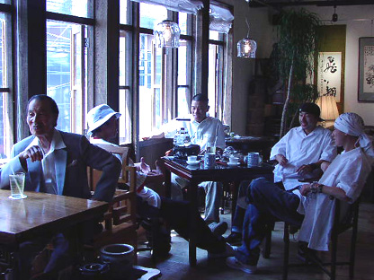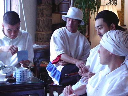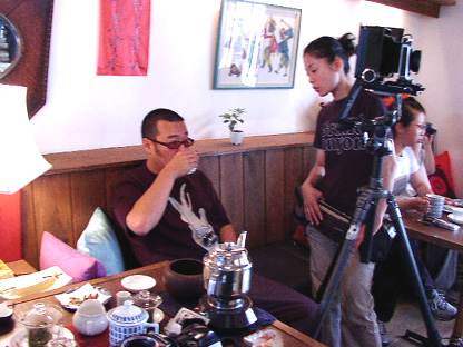次は窓際の席で撮影。テーブルを囲んでリラックスした雰囲気で会話を続けるFIRE BALLの面々。インターナショナルスクール出身のメンバーもいるので、ときどき英語が混じります。FIRE BALLの皆さんがポラチェック。平間さんは合間にお茶を飲みつつシャッターを切ってました。
