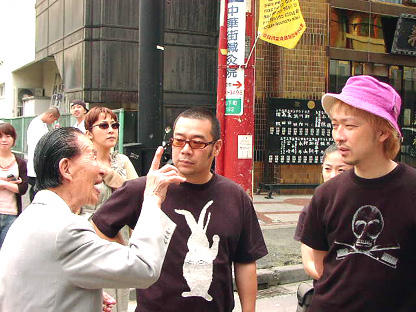 打ち合わせをする平間さん&箭内さん、と中華街の歴史を語る梁さん。中国語まじりだけに真剣な顔で説明を聞いてます。