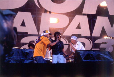 a!:そして〈GRASS STAGE〉のKICK THE CAN CREWに。エミネム来日公演のファッションを彷佛とさせる黄色のTシャツとキャップのKREVAが、曇天の天候を指して「俺がお前たちの太陽になってやる!……みたいな、ね」とギャグ混じりの決意表明。その言葉に偽りなしのアゲアゲ・ヒップホップ・ショウを展開してくれたね。