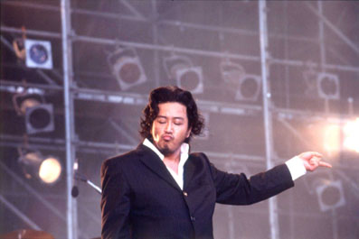 a!:……と思って設置されている大画面を見るとアップになった岡村ちゃんの右斜め45度に向けられた鋭い目線はしっかりあさっての方向を見てるし、口元には例の挑戦的な笑みが。ま、相変わらずナルシス越えて岡村ワールドが炸裂してるんですが、〈シンガーソングライターダンサー〉たる彼の佇まいはいまだにこれだけの人を興奮させる。それだけで復活の意味大ありっしょ。