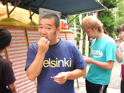 集合場所は浅草寺近くにある「雷5656(ゴロゴロ)会館」。まずは制作スタッフが先に現地入りしてロケハンを開始。仲見世通りで見つけた出来たての人形焼がウマイ!カメラマン平間さんとディレクター箭内さんは、おみくじならぬ姓名判断を見つけてしばしハマる!ひととき下町を楽しみます。