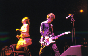 続いては、ヤー・ヤー・ヤーズの登場。メンバーが3人で、ドラマー、ギタリスト、ヴォーカリストというライアーズと同じ編成でありながら、音の印象は大きく違っていた。隙間のあるガレージ・サウンドではあるものの、リズムとソロを効果的に使い分けるギターと、タイトなドラミングがその隙間を補うような役割を果たしている。そしてなにより、ヴォーカル、カレン嬢の存在感が観客を引き付けて離さない。それは、彼女が女性性を強く出したパフォーマンス――たとえば、客を挑発するようなセクシーな衣装だったり、セックスを連想させるようなポーズをとったり――というような理由からではなく、もっと内在的な、90年代のコートニー・ラヴのようなオルタナ界のアイドルが持っていた〈華〉を彼女も持ち合わせているということなんだろう。カレンの一挙手一投足に合わせて会場の盛り上がりも左右されてしまう、そんなイメージすら抱いたほどだ。アルバム『Fever To Tell』からの曲を中心にしつつも、新曲と思しき曲も演奏していたので、既に次の作品の構想は見えているのかもしれない。